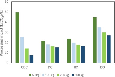 This paper presents an analysis of the sustainability impact of different oral solid dosage manufacturing platforms using life cycle assessment (LCA) methodology. The carbon cost of continuous direct compression (CDC), roller compaction (RC), direct compression (DC) and high shear granulation (HSG) is considered as a function of manufacturing scale, accounting for material, yield losses, process and equipment, cleaning, and utility impacts. The LCA calculations are integrated within a system model for the CDC platform (CDC digital twin), and performance is assessed using feeder variability with different blender residence masses, to demonstrate proof-of-concept for consideration of carbon footprint within process optimisation.
